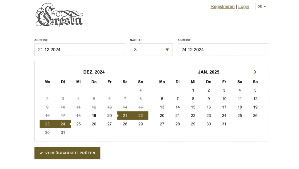 Mit dem Wechsel zur Cresta AG wurde ein neues Buchungssystem eingeführt, das den Service für unsere Gäste deutlich verbessert. Die Belegung der einzelnen Zimmer ist nun online abrufbar, Rechnungen werden automatisch versendet und Sie können bequem per Kreditkarte oder Überweisung zahlen. Erfahren Sie mehr und prüfen Sie die Verfügbarkeit online!